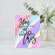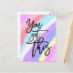 ¡Dale un empujón a alguien y envíale una postal con un mensaje de aliento colorido! Esto tiene palabras inspiradoras You Got This en una tipografía elegante de escritura negra en un fondo con un patrón de arcoiris a rayas brillantes en azul, lila, coral, amarillo y blanco.