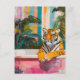 Descubra el cautivador cuadro minimalista de un tigre relajándose en una bañera, situada en un vibrante jardín tropical. Este poster a gran escala presenta colores llamativos, elementos gráficos y líneas expresivas, creando una pieza de arte mural única y sofisticada.