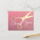 Plantillas de tarjetas postales de agradecimiento para salón de belleza / peluquería / estilista / artistas de maquillaje / estilistas / planificadores de bodas / planificadores de eventos / consultores / dueños de boutique / fashionistas - Tijeras de oro falso modernas sobre fondo degradado rosa.