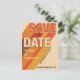 Una tarjeta postal para guardar la fecha con estilo de póster de concierto. El texto con sombra larga y rayas diagonales en diferentes colores se extiende a través de la tarjeta enfatizando el mensaje de "Guardar la fecha". Una primera impresión única y genial para tu boda con vibraciones retro - cuando tus invitados reciban esta tarjeta postal, sabrán que la diversión está por venir. Tipografía en negrita. Colores auténticos de los setenta: naranja quemada, rojos y marrones. Tipografía retro en negrita para un estilo retro de los setenta. El dorso de la tarjeta es naranja con acentos rayados en las esquinas, un lugar donde puedes agregar más información y un código QR para que los invitados puedan visitar el sitio web de tu boda.