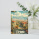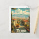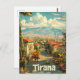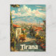 Una vibrante y colorida representación de Tirana, la capital de Albania, mostrando su mezcla de arquitectura histórica y moderna. El diseño presenta puntos de referencia notables, calles bulliciosas y paisajes urbanos animados, todo ilustrado con un estilo nostálgico y retro. Esta obra de arte captura el espíritu dinámico y el encanto único de Tirana, invitando a los espectadores a descubrir su variado patrimonio cultural.