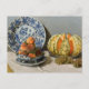 Postal de arte fino con la pintura impresionista, Still Life with Melon (1872) de Claude Monet (1840-1926). Una vibrante mesa de melón maduro y melocotones junto a un plato de porcelana azul y blanco.