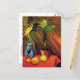 Una postal con la pintura, Still Life with Palms (c. 1910), de August Macke (1887-1914), un artista expresionista alemán que murió durante la Primera Guerra Mundial a los 27 años. Fue uno de los principales miembros del grupo Blue Rider (Der Blaue Reiter). Estaba influenciado por el cubismo. Se muestra una palmera verde machacada y manzanas sobre un mantel naranja.