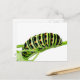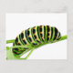 Una oruga de cola negra de cigalas verde brillante sentada en una hoja de apio sobre fondo blanco.