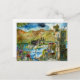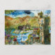 Postal de una ilustración original en acuarela que captura una vieja torre a orillas de un lago, en un balneario abandonado.