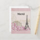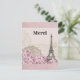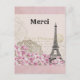 Esta postal presenta un dibujo vintage de la Torre Eiffel en París, Francia con flores rosas. La postal dice "Merci", o "gracias" en francés.