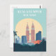 Captura el cálido y soleado espíritu de la capital de Malasia con esta hermosa postal de Kuala Lumpur, diseñada en un encantador estilo retro! Esta vibrante postal de viaje vintage cuenta con la silueta de las torres gemelas Petronas de la ciudad contra un sol estilizado, con exuberantes palmeras tropicales en primer plano. La paleta de colores cálidos y acogedores evoca el soleado y moderno ambiente de Kuala Lumpur.