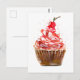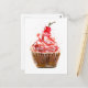una acuarela tradicional, un bizcocho de aspecto delicioso con una cubierta cremosa y una cereza en una postal.