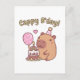 Un garabato de un carpincho lindo que lleva un sombrero de cumpleaños celebrando con una torta de cumpleaños de chocolate con glaseado y cobertura de arcoíris y globo de lunares. La divertida leyenda con juego de palabras dice ¡Cumpleaños de Carpincho!