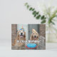 Esta tarjeta postal presenta una fotografía de dos perros retriever dorados sonrientes celebrando un cumpleaños al aire libre, con una torta de cumpleaños azul. El texto personalizable en la parte posterior dice: "¡Celebremos!"