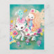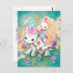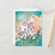 Un pequeño chica pelirrojo, de pelo largo y suave naranja, acentuado con una rosa rosa rosa, vestido con un vestido azul y piernas azules, ¡paseando en una divertida tortuga! La mágica tortuga es blanca, con manchas verdes, y su caparazón tiene rosas rosas. Ella lleva un gran tazón rosado en su cabello (después de todo, es una tortuga mágica). Las setas con foco y las flores brillantes realzan el paisaje del jardín, y las mariposas amarillas se deslizan alrededor.