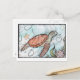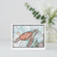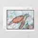 Una hermosa postal con una tortuga marina nadando en el océano profundo rodeada de burbujas y flora.