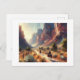 Una vibrante escena representa a los vaqueros recorriendo un majestuoso cañón del desierto al atardecer, con acantilados imponentes y vegetación dispersa que realzan el paisaje. Los colores vivos y las pinceladas crean un ambiente dinámico y casi surrealista.