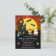 Esta divertida y espeluznante invitación de cumpleaños presenta a una bruja y un fantasma lindos junto a una casa embrujada torcida. Al fondo hay una luna llena con murciélagos y un cielo nocturno naranja con estrellas. El texto combina fuentes decorativas y serif para un look elegante y moderno. Esto es perfecto para Halloween.