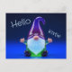 A sleek and contemporary 3D digital render of a stylized garden gnome figurine made from polished, translucent glass. The figurine features a tall, curved purple hat and a luminous white beard that glows with a soft blue light from the base. With its arms outstretched in a welcoming gesture, the gnome sits against a vibrant, deep blue gradient background. Customize it with a name of your choice.