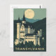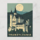 Step into the land of myth and legend with this atmospheric Transylvania Travel Postcard. This vintage-style illustration features a majestic Gothic castle nestled in the dark mountains, illuminated by a hauntingly beautiful full moon.
