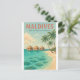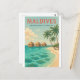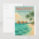 Travel poster featuring the Maldives in a serene retro tropical travel style. Crystal-clear turquoise ocean with coral reefs visible beneath the water, white sand beaches, overwater bungalows on wooden stilts, and tall palm trees swaying gently. Calm sky with soft clouds and warm sunlight. Retro color palette: turquoise blue, aqua, sandy white, soft coral, pastel sky blue. Clean graphic composition with subtle grain texture. Add elegant vintage travel typography: “MALDIVES” with smaller text “Indian Ocean Paradise”. Vertical 2:3 layout, high-resolution for print.