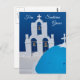 Postal de Santorini, Grecia, mostrando las tres campanas de Fira. Esta imagen fotográfica captura el azul del mar detrás. Santorini es una de las islas griegas más populares y, tras su visita, no es difícil entender por qué. Hay dos pueblos idílicos en la capital Fira y la ciudad de Oia donde la gente se reúne para ver la espectacular puesta de sol todos los días. Ambos tienen muchos edificios blancos encalados y calles estrechas, así como iglesias con cúpulas azules. Santorini es una isla griega muy popular para las parejas que quieren casarse bajo el sol. Si quieres ir a la playa, deberás alejarte de Fira y Oia, ya que son bonitos, no tienen playa. postal de Santorini, Grecia