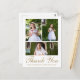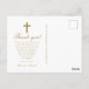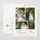 Esta elegante tarjeta postal de agradecimiento por la Primera Comunión católica presenta una portada con un collage de tres fotos con tipografía dorada sobre fondo blanco, un dulce mensaje de agradecimiento editable está en la parte posterior con una simple cruz dorada y dirección de remitente. Esta tarjeta de agradecimiento por la Primera Eucaristía es editable para una variedad de ocasiones religiosas cristianas, o para actualizar a su propio mensaje personal de agradecimiento. Esta tarjeta también está disponible en negro.