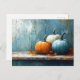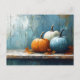 Una acogedora pintura impresionista de inspiración otoñal con tres calabazas, naranja, blanca y azul, sobre una mesa de madera templada. Las cálidas hojas de otoño y las pinceles texturadas realzan el encanto rústico de la casa de campo.