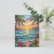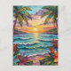 Pretty postcard to say hi and keep in touch with friends and family whole on vacation with a gorgeous ai impasto oil painting style illustration of the blue ocean, a sandy beach surrounded by palm trees at sunset.