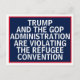 Descripción de la imagen: caja rectangular de color azul medio noche con un borde rojo brillante sobre un fondo blanco. Blancas todas las gorras son sans serif el texto dice en seis líneas, "Trump y la administración del GOP están violando la Convención de los Refugiados".