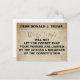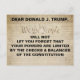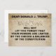 Donald Trump, nosotros, el pueblo, no dejaremos que se olvide que sus poderes están limitados por los controles y equilibrios de la Constitución. El 12 de febrero de 2017, el asesor principal del presidente Stephen Miller dijo, "los poderes del presidente para proteger nuestro país son muy sustanciales y no serán cuestionados", haciendo eco del argumento que el abogado del gobierno estadounidense hizo y que fue rechazado por el Tribunal de Apelaciones del 9º Circuito. Recuerden al Presidente que no es un dictador y está sujeto a los controles y contrapesos de la Constitución de los Estados Unidos y nosotros, el pueblo, actuando individual y colectivamente, seguiremos cuestionando su poder y autoridad. Texto sobre los antecedentes de la Constitución de Estados Unidos: Querido Donald J. Trump, nosotros, el pueblo, no olvidaremos que sus poderes están limitados por los controles y equilibrios de la Constitución.