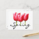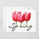 Celebra la primavera con esta tarjeta postal que muestra un trío de tulipanes de color rosa con un diseño de texto "Primavera".