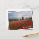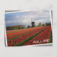 Postal de un paisaje primaveral con un campo de tulipanes rojos y otras flores y un molino de viento durante el amanecer en los jardines de Keukenhof, región de Bulb, Países Bajos con un borde blanco y el texto "Holanda". La tarjeta está un poco rotada para crear la ilusión de que está suelta.