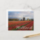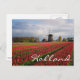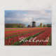 Postal de un paisaje primaveral con un campo de tulipanes rojos y otras flores y un molino de viento durante el amanecer en los jardines de Keukenhof, región de Bulb, Países Bajos con el texto "Holanda".