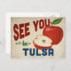 A charming Tulsa Oklahoma vintage travel postcard featuring a lovely red apple, along with fun retro style text that says, "See you in Tulsa"