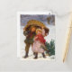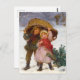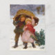 Vintage illustration of a boy and a girl joyfully dragging a holly tree through the winter forest while carrying a basket over their head to protect themselves from the falling snow. Nostalgic oil painting by English artist Frederick Morgan.