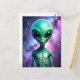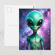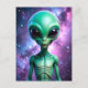 Alien vert avec de grands yeux noirs en amande avec en arrière plan des galaxies