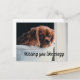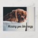 Postal con la foto de un adorable cachorro que se ve muy triste y solitario. El texto dice: "Te falta como loco".