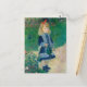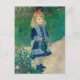 Este encantador cuadro fue pintado por Pierre-Auguste Renoir en 1876. La preciosa niña es Mademoiselle Leclere, con un vestido azul y una lata de agua. Renoir era impresionista. Se puede ver que, en lugar de mezclar los colores del cuadro, Renoir los aplicó con toques individuales del pincel que disuelven los bordes y parecen brillar con luz. (El diseño que se ve en el interior de esta postal es un hermoso patrón de tela blanca floral jacquard.)