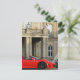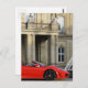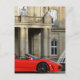 Un coche deportivo rojo de Maranello, Italia, se encuentra frente al Nuevo Castillo de Stuttgart. El coche es un símbolo de lujo, de conducción deportiva y de elegancia atemporal. Un sueño para cada amante de los coches frente a un hermoso castillo al sol de la noche.
