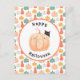 Un lindo gato negro mira por encima de una feliz calabaza naranja rodeada por las palabras Feliz Halloween.