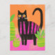 Postal Un gato negro con rayas rosas y plantas domésticas