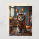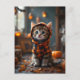 Un lindo gatito con un abrigo negro y naranja en Halloween. ¡bonito, tarjeta personalizado de Halloween para todos!