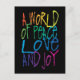 Las palabras "Un mundo de paz, amor y alegría" en los colores del arcoiris. La paz mundial comienza con cada uno de nosotros. Arte de la artista Margaret Loftin Whiting.