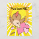 Dibujo personalizado de una pequeña aleta de javan munia saltando alto gritando su corazón fuera: ¡ME AMAS! Con corazones y plumas rosas volando, y el sol arde con destellos en el fondo. Esta postal con el adorable dibujo de un pájaro es perfecta para un regalo especial para celebrar el día de San Valentín o el aniversario del boda, para mostrar amor a tu amigo chica, amigo, esposo y esposa. :) Por cierto, este lindo personaje de pájaro es de mi webcómic de aves que se basa en mi vida diaria con mis pájaros mascotas.