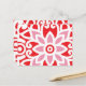 El diseño presenta un patrón simétrico con una combinación de colores rojos y blancos. En el centro, hay un diseño floral estilizado con capas de pétalos irradiando hacia afuera. Alrededor de este motivo central se encuentran elementos giratorios y formas decorativas adicionales, creando un aspecto equilibrado y armonioso. El uso de sólo dos colores hace que el diseño sea muy elegante.