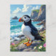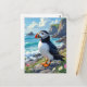 Un bonito y colorido ilustracion aéreo de un puffing observando las olas del océano a orillas del mar rodeado de rocas, dunas y flores en una postal sólo para saludar y mantenerse en contacto con un amigo o familiar.