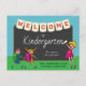 Bienvenidos a la guardería con esta magnífica postal. El diseño incluye bonitos ilustraciones personalizados de niños con mochilas y un profesor escribiendo en una pizarra. Personaliza con el nombre del profesor y la escuela.