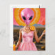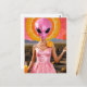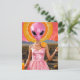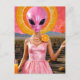 Una mujer alienígena vestida de rosa y perlas con un vaso de jugo de naranja se para en un extraño planeta con una naranja de luna surrealista arte mediático mixto generado por IA