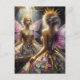 Una hermosa hada con un vestido de colcha y una corona dorada haciendo su parte para ayudar a salvar el planeta recuperando telas de época para crear nuevas prendas de vestir mira su nuevo vestido hecho de telas recuperadas en el espejo