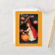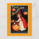 La clásica vintage tarjeta de Halloween muestra a una niña vestida con un gorra rojo y un manto rodeado de cuatro calabazas y nos desea "Una Halloween alegre".