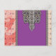 El diseño muestra un patrón de tela muy bien detallado. Aquí hay un desglose de sus elementos: ・ Diseño central: una franja violeta audaz es el punto focal, flanqueada por patrones blancos intrincados y simétricos sobre un fondo gris. ・ Área circundante: Motivos más pequeños y repetitivos en un matiz parduzco sobre un fondo más ligero, posiblemente indicando una costura o bordado. ・ Fronteras: El patrón está bordeado por otro diseño detallado en blanco y gris similar al central, pero a menor escala.