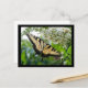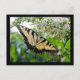 Una mariposa con alas amarillas y negras está colgada en flores blancas, bebiendo néctar. El fondo está repleto de vegetación exuberante, lo que crea un entorno natural sereno.