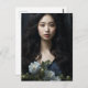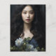 Postal Una mujer hermosa con el pelo largo negro y flores